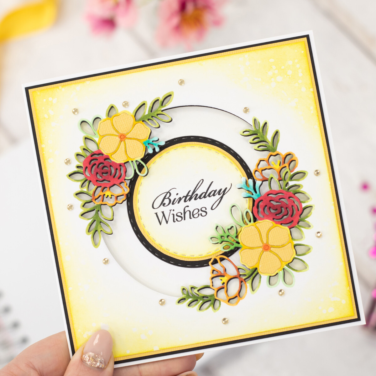 Deze set bevat een speciale stans om daarmee een ​​rond frame uit te stansen versierd met lieve en delicate bloemen. Dus perfect voor in kaarten of geschenkdoospanelen. Plus vier stempels, zodat je de boodschap kunt veranderen en een gepersonaliseerde kaart voor bijvoorbeeld familie en vrienden kunt maken.