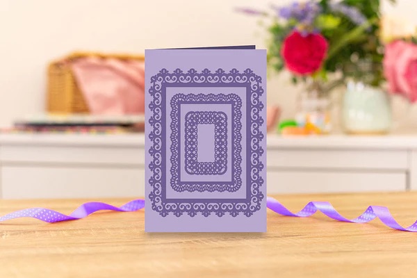 Vintage decoraties. De Crafter’s Companion Lace Nesting Snijmal – Antique Frames bevat drie stansen om drie in elkaar passende rechthoekige frames te snijden. Elk frame is gevuld met delicate en op erfgoed geïnspireerde decoraties om een elegant effect te creëren.