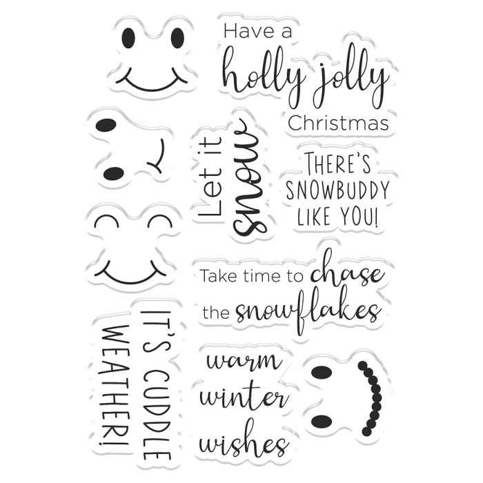 Een leuke finishing touch.Je ontvangt ook tien clearstempels met details om een gezichtsuitdrukking voor je sneeuwpop te kiezen, evenals een reeks vrolijke kerstboodschappen zoals ‘Warm Winterwishes’ en ‘Have a holly jolly Christmas.’ Maak jouw handgemaakte kaart af met een doordachte, kerst boodschap, klaar om naar familie en vrienden te sturen.