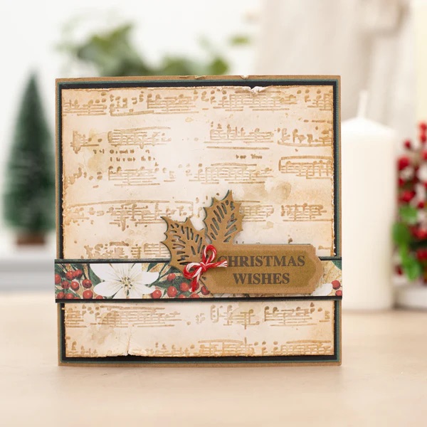 De Holly&Ivy – 2D Embossingfolder – Christmas Music van Nature’s Garden bevat een embossingfolder om een 2D-ontwerp van vintage bladmuziek te maken.