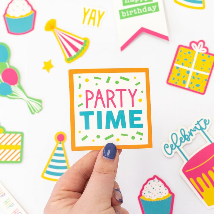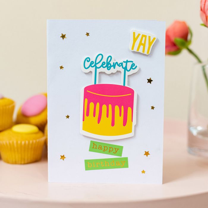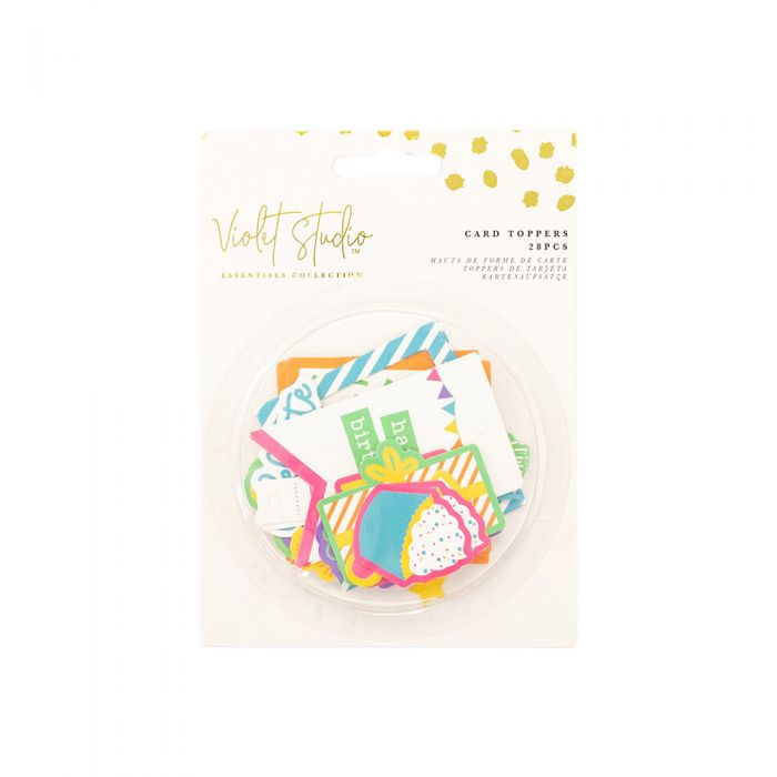 Het Violet Studio Assorted Toppers Party-pakket bevat een volledige gastenlijst met uitgestanste ontwerpen, met feestmutsen, taarten, geschenken en sentimenten zoals ‘Celebrate’ en ‘Yay!