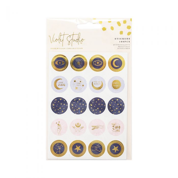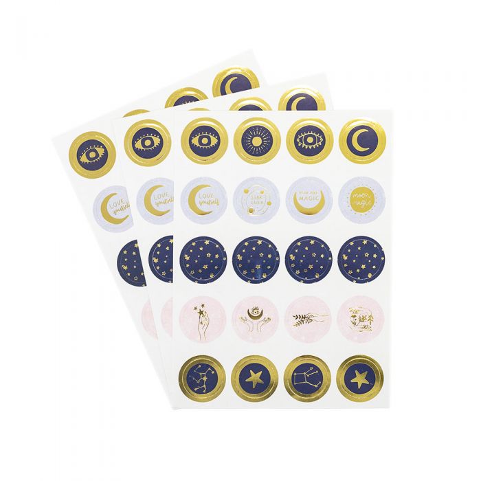 Droom weg naar een nieuwe dimensie van buitenaardse schoonheid met de Cosmic Dreamer Mini Stickers. Dit pakket bevat 100 ronde stickers met illustraties van sterren, sterrenbeelden, maansikkels en berichten zoals ‘You are Magic’. Gouden accenten worden gecombineerd met donkere en contrasterende bleke tinten om een opvallende look te creëren.